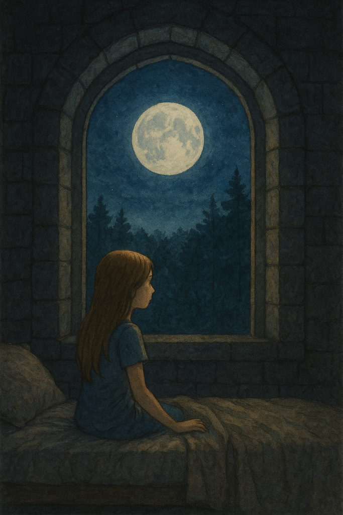 After their short conversation, the girls smiled at each other, and in their hearts, they already knew they would become the best of friends. Luna lay warmly and peacefully on her bed near the window, gazing at the bright, stunning moon hanging outside the ancient stone frame.