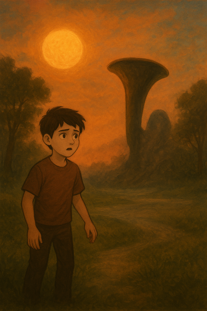 At last, they reached a vast lake. Ezo stepped forward, muttered an incantation, and to Rin’s amazement, the water drained away. Instead of a sandy lakebed, a massive copper structure rose up, shaped like an enormous trumpet.