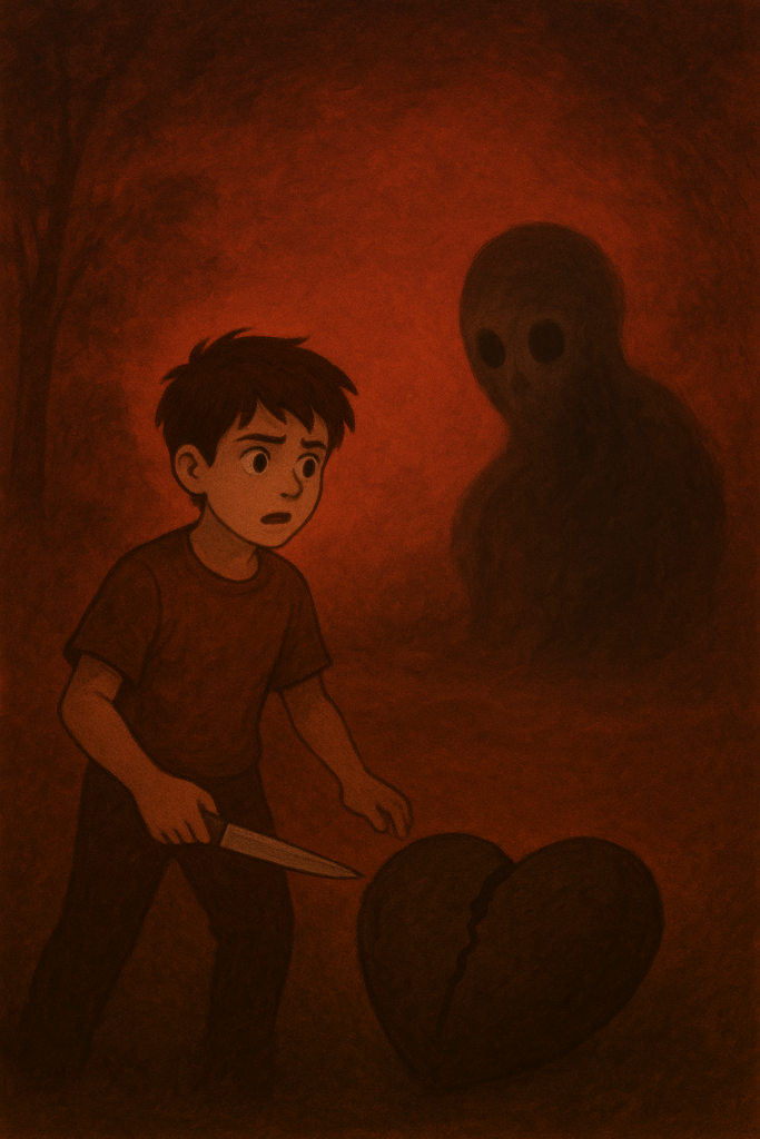 Inside, a massive black heart pulsed in the center of the cavern. Rin approached it, drawing a deep breath.